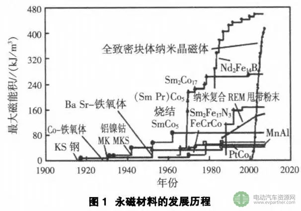 常用的主要種類有:鐵氧體永磁材料、鋁鎳鈷永磁材料和釹鐵硼稀土永磁材料等。永磁材料的發(fā)展歷程如圖1所示。